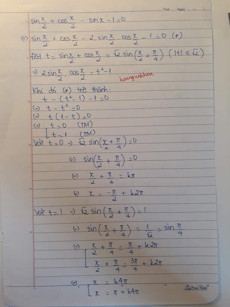 `⇔sin \frac{x}{2} + cos \frac{x}{2} - sin2. \frac{x}{2} - (sin^2\frac{x}{2}+cos^2\frac{x}{2}) = 0`