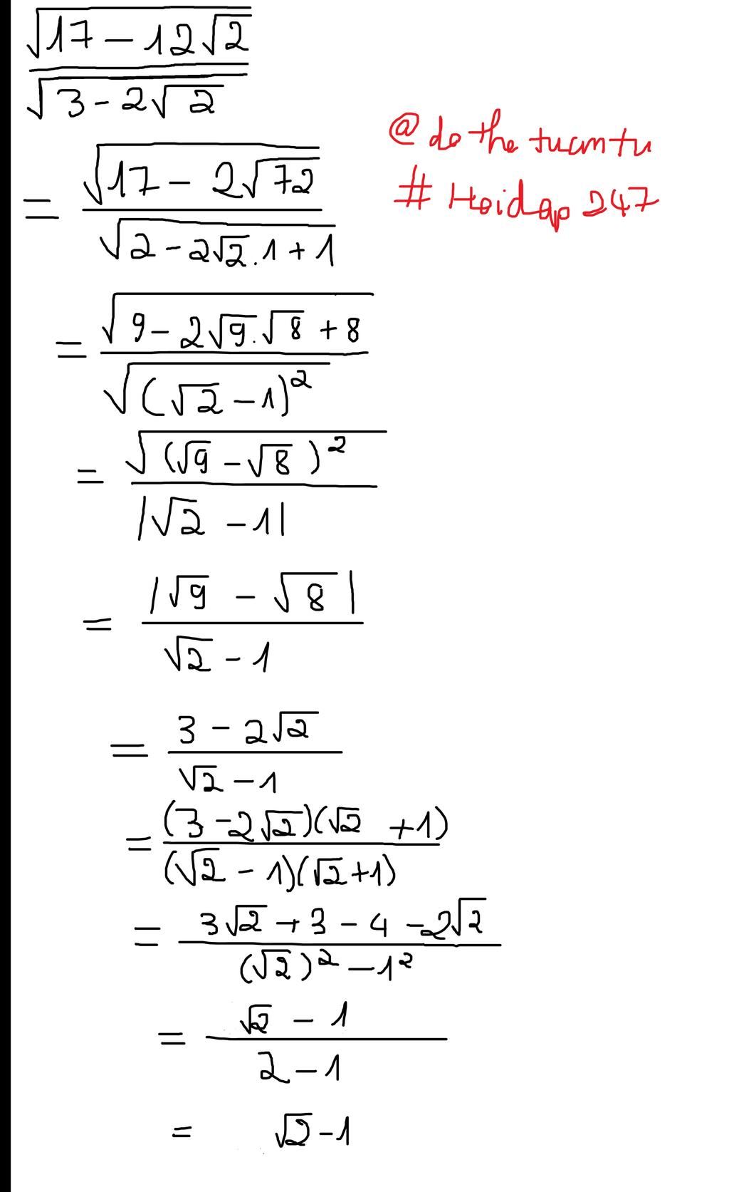 $\dfrac{\sqrt{17-12\sqrt{2}}}{\sqrt{3-2\sqrt{2}}}\\ =\dfrac{\sqrt{9-2.3.2\sqrt{2}+8}}{\sqrt{3-2\sqrt{2}}}\\ =\dfrac{\sqrt{(3-2\sqrt{2})^2}}{\sqrt{3-2\sqrt{2}}}\\ =\dfrac{|3-2\sqrt{2}|}{\sqrt{3-2\sqrt{2}}}\\ =\dfrac{3-2\sqrt{2}}{\sqrt{3-2\sqrt{2}}}\\ =\sqrt{3-2\sqrt{2}}\\ =\sqrt{2-2\sqrt{2}+1}\\ =\sqrt{(\sqrt{2}-1)^2}\\ =|\sqrt{2}-1|\\ =\sqrt{2}-1.$