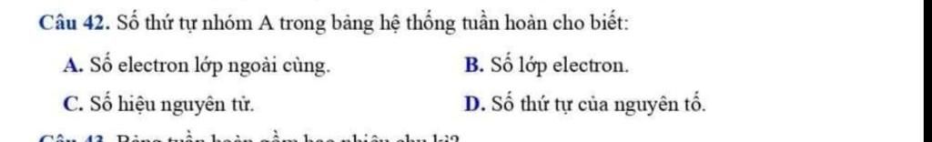 Số thứ tự nhóm `A` trong bảng hệ thống tuần hoàn cho biết `:` Số electron lớp ngoài cùng.
