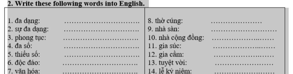 1.Đa dạng:diversity 8.Thờ cúng: worship