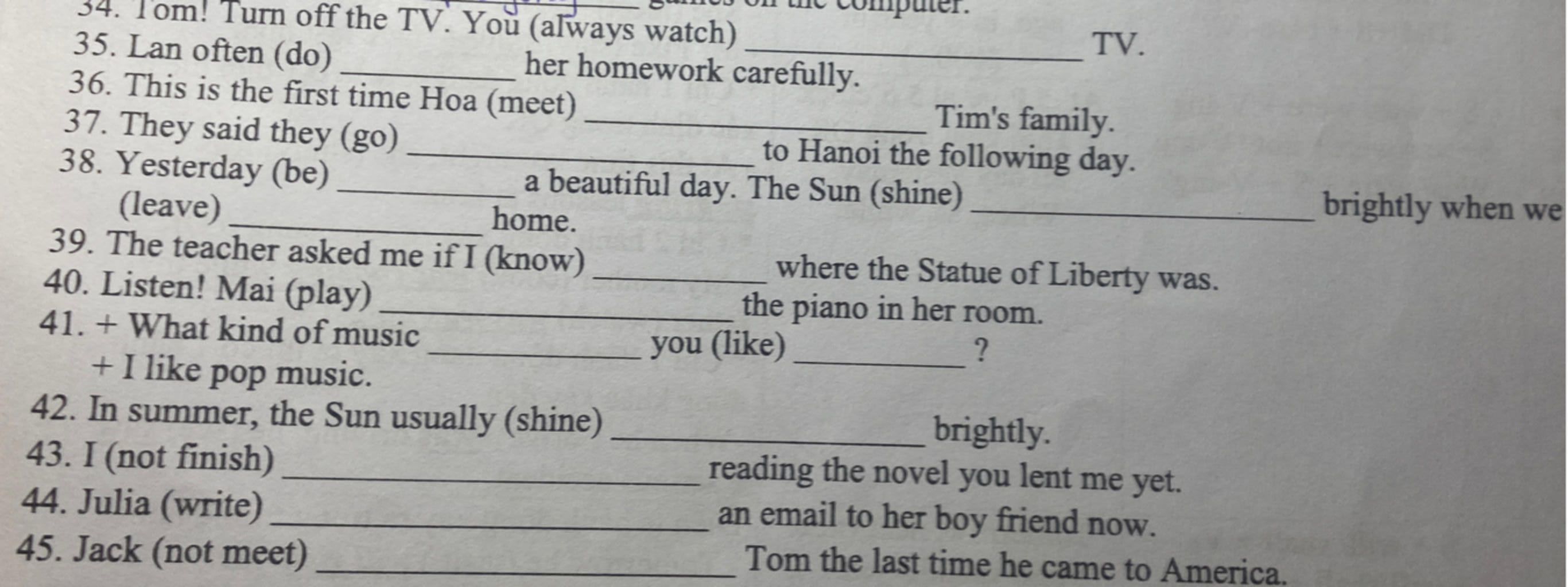 45. Jack (not meet) hasn't met Tom the last time he came to America. (Hiện tại hoàn thành - S + have/ has + V3)