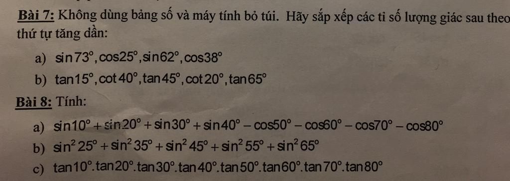 Bài 7: Không dùng bảng số và máy tính bỏ túi. Hãy sắp xếp các tỉ số lượng giác sau theo