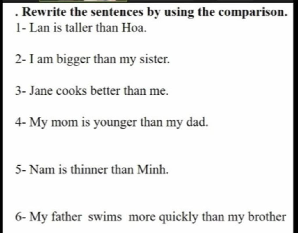 5.Minh is fatter than Nam (thin : gầy , mỏng manh >< fat : béo)