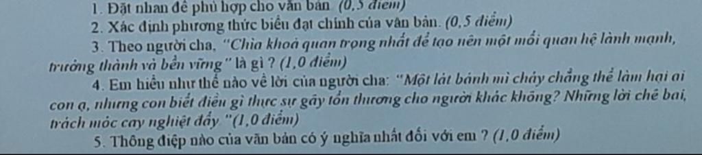 Câu 4: Qua câu nói của người cha em có thể thấy được mạng những sai sót nhỏ có thể sửa chữa được sẽ không gây tổn thương cho người khác.Nhưng vì những sai lầm nhỏ đó mà trách móc họ sẽ gây tổn thương gây buồn bã cho người mắc sai lầm.Qua đó mỗi chúng ta phải biết học cách chấp nhận sai sót của người khác và chọn cách ủng hộ những khác biệt của họ có như vậy mới có thể tạo nên một mối quan hệ lành mạnh