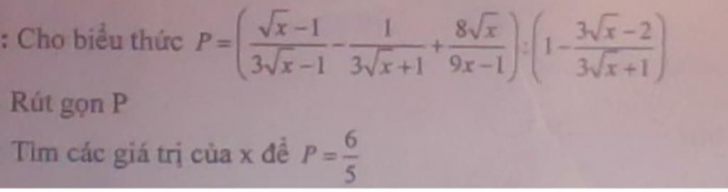 `P=((\sqrt{x}-1)/(3\sqrt{x}-1)-1/(3\sqrt{x}+1)+(8\sqrt{x})/(9x-1)):(1-(3\sqrt{x}-1)/(3\sqrt{x}+1))`