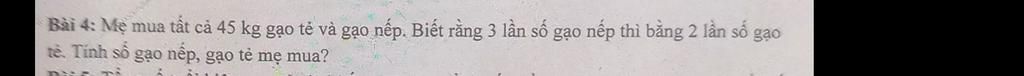 Biết rằng `3` lần số gạo nếp thì bằng `2` lần số gạp tẻ. Vậy số gạo nếp bằng `3/2` số gạo tẻ