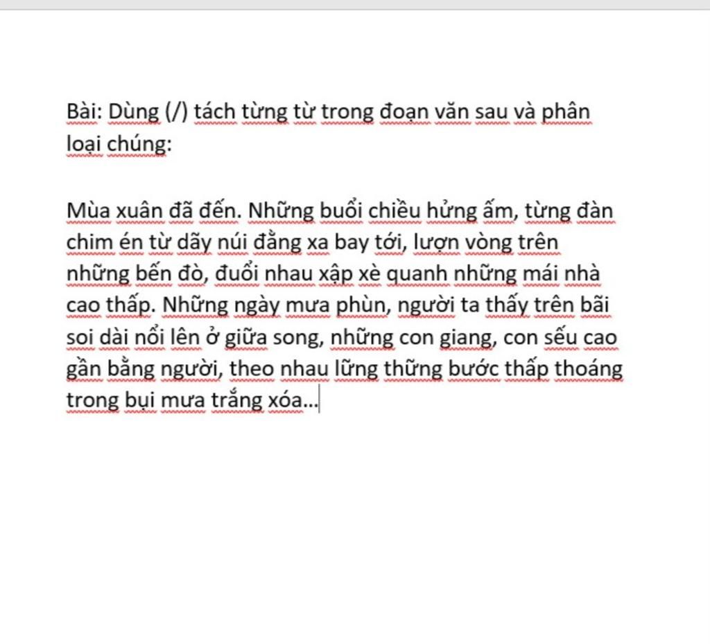 Mùa xuân/ đã/ đến/. Những/ buổi chiều/ hửng ấm/, từng/ đàn/ chim én/ từ/ dãy núi/ đằng xa/ bay/ tới/, lượn vòng/ trên/ những/ bến đò/, đuổi/ nhau/ xập xè/ quanh/ những/ mái nhà/ cao thấp/. Những/ ngày/ mưa phùn/, người ta/ thấy/ trên/ bãi soi/ dài/ nổi lên/ ở/ giữa/ song/, những/ con giang/, con sếu/ cao/ gần/ bằng/ người/, theo/ nhau/ lững thững/ bước/ thấp thoáng/ trong/ bụi mưa/ trắng xóa...
