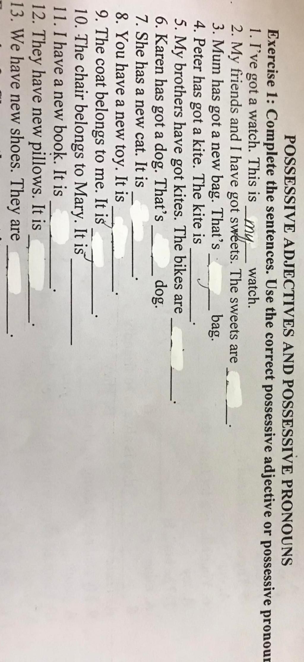 Exercise 1: Complete the sentences. Use the correct possessive adjective or possessive pronour