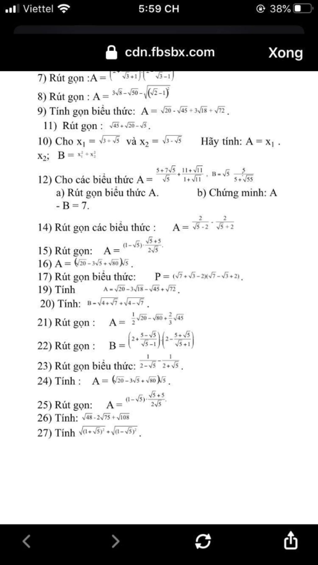 9) Tính gọn biêu thức: A= v20 - V45 + 3V18 + 72.