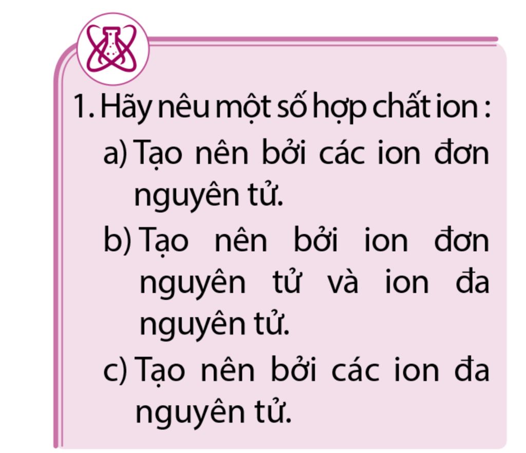 b) Tạo nên bởi ion đơn nguyên tử và ion đa nguyên tử là \(NH_4^{}Cl;KNO_3^{};BaSO_4^{}\)