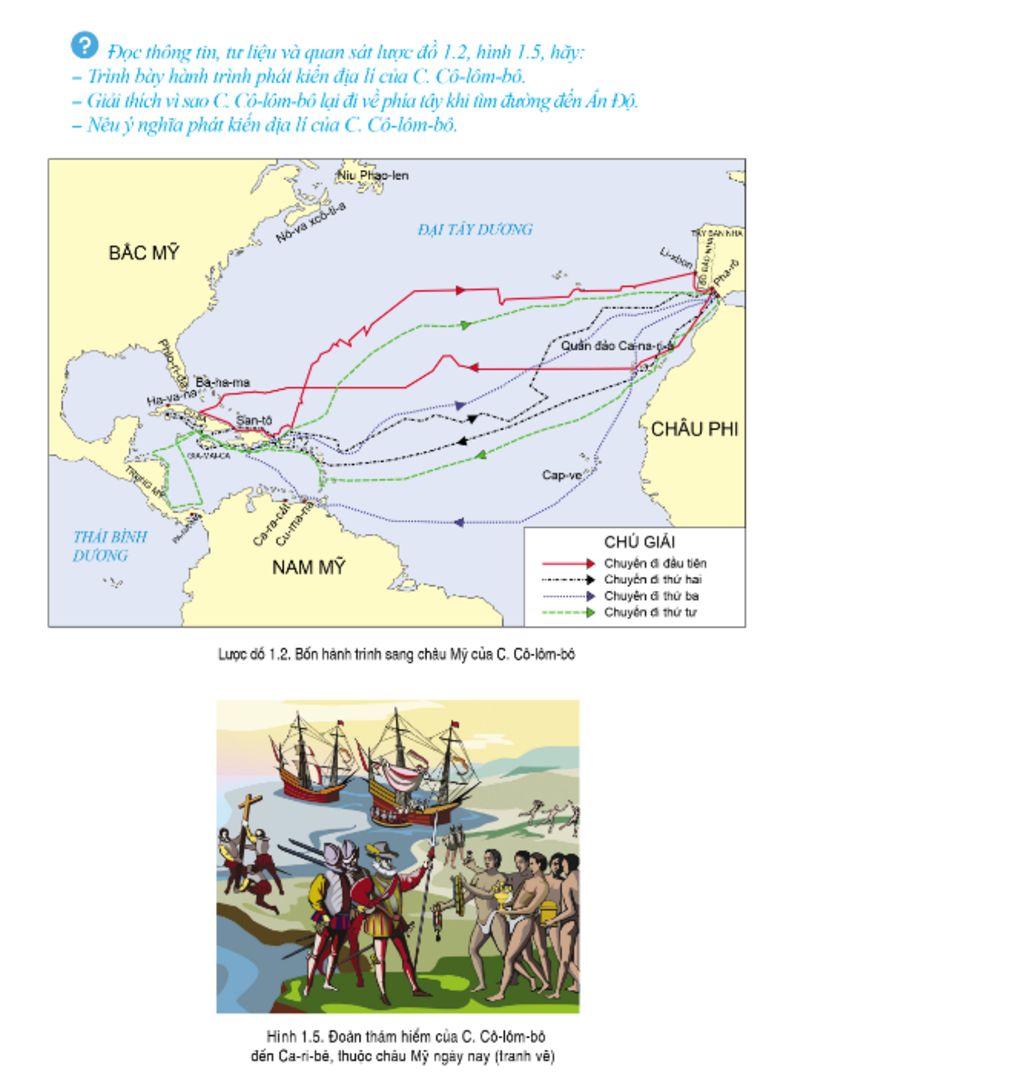 + Tháng 8/1492, trên C. Cô-lôm-bô bắt đầu hành trình của mình với ba con tàu. Sau hơn 2 tháng lênh đênh trên biển, ông và đoàn thủy thủ dũng cảm đã đến được một số đảo thuộc vùng biển Ca-ri-bê ngày nay. Ông đinh ninh rằng mình đã tới được “Đông Ấn Độ”, nhưng thức ra đó là vùng đất mới – châu Mỹ.