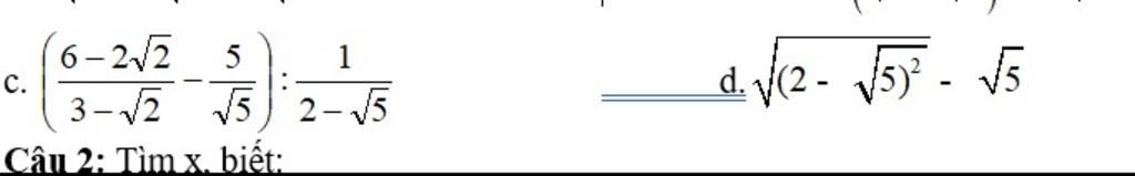 c, $\bigg(\dfrac{6-2\sqrt 2}{3-\sqrt 2}-\dfrac{5}{\sqrt 5}\bigg):\dfrac{1}{2-\sqrt 5}\\=\bigg(\dfrac{2(3-\sqrt 2)}{3-\sqrt 2}-\sqrt 5\bigg).(2-\sqrt 5)\\=(2-\sqrt 5)^2\\=9-4\sqrt 5$