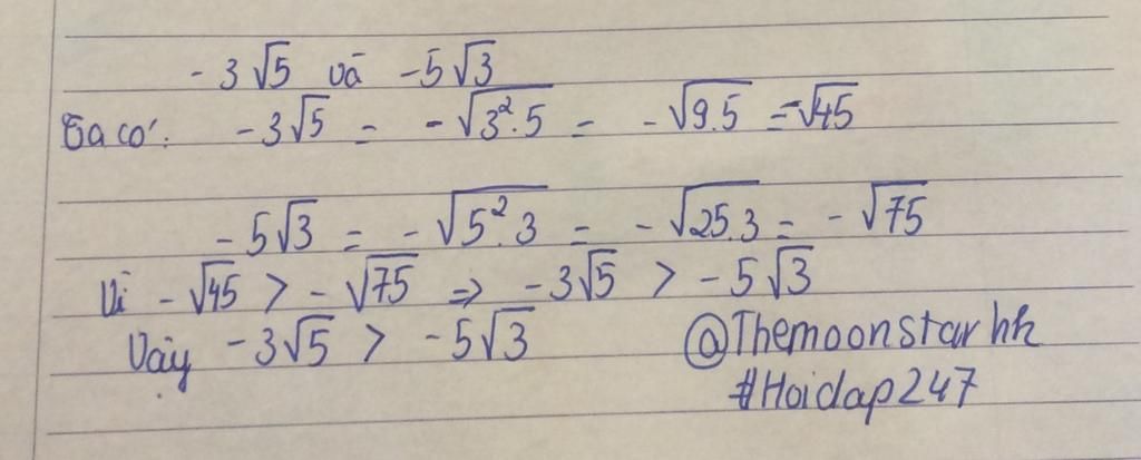 Sửa lại bài đi bạn 🤨 `-3\sqrt{5}< -5\sqrt{3}` à? Với `-3\sqrt{5}=-\sqrt{45}`!