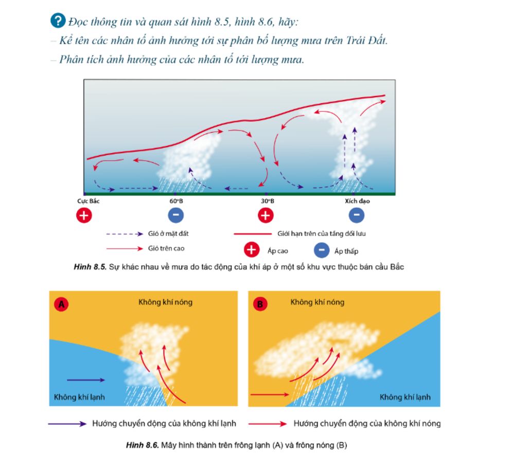 - Các nhân tố ảnh hưởng đến lượng mưa: Khí áp; Gió; Frông; Dòng biển; Địa hình