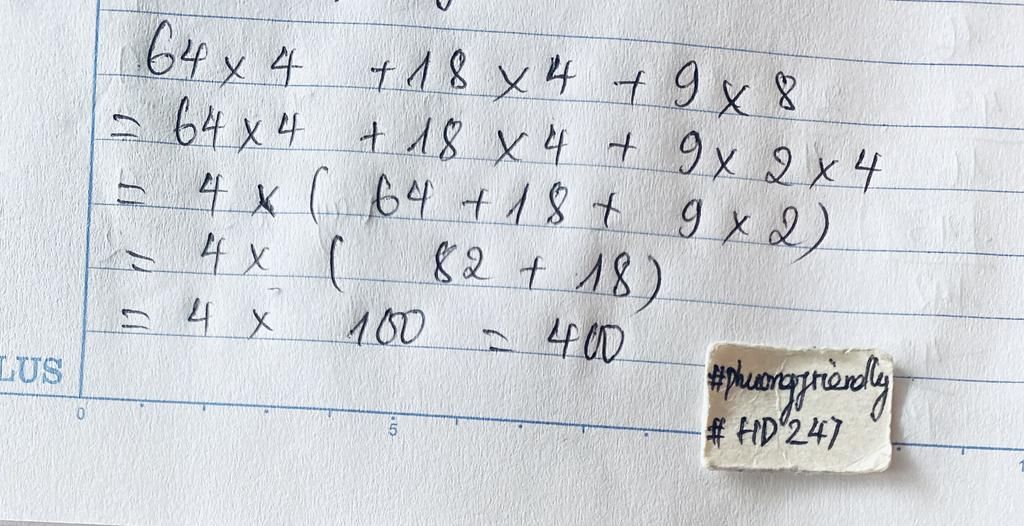 `64 xx 4 + 18 xx 4 + 9 xx 8` $\\$ `=64 xx 4 + 18 xx 4 + 9 xx 2 xx 4` $\\$ `=64 xx 4 + 18 xx 4 +18 xx 4` $\\$ ` = 4 xx (64 + 18 + 18)` $\\$ `= 4 xx 100` $\\$ `= 400`