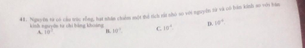 `<=>{r_{\text{hạt nhân}}}/{r_{\text{nguyên tử}}}=10^{-4}`