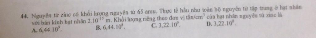 `-> D = m/V = (1,079.10^(-28))/(3,35.10^(-38)) = 3,22.10^9` $\text{tấn/cm³}$