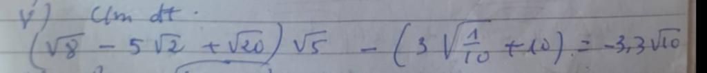 $(\sqrt{8}-5\sqrt{2}+\sqrt{20}).\sqrt{5}-\left(3\sqrt{\dfrac{1}{10}}+10\right)\\=(2\sqrt{2}-5\sqrt{2}+2\sqrt{5}).\sqrt{5}-\dfrac{3}{\sqrt{10}}-10\\=-3\sqrt{10}+10-\dfrac{3\sqrt{10}}{10}-10\\=\dfrac{-30\sqrt{10}-3\sqrt{10}}{10}\\=-\dfrac{33\sqrt{10}}{10}\\=-3,3\sqrt{10}$