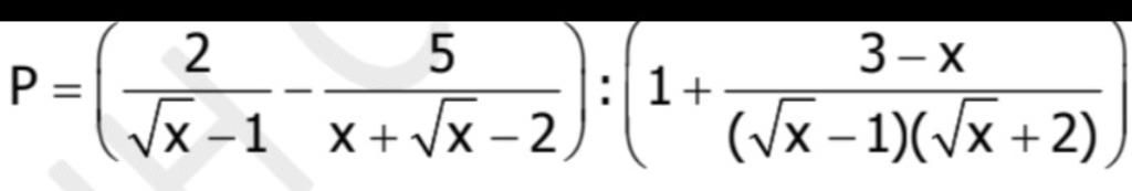 `P= (2/(sqrtx -1)-5/(x+sqrtx -2)): (1+ (3-x)/((sqrtx -1)(sqrtx +2)))` `(đk: x ≥0; x ne 1)`
