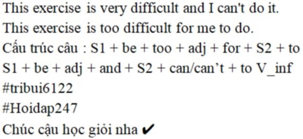 `-` S + be + too + adjective + ( for somebody ) + to V nguyên thể : quá ... đến nỗi