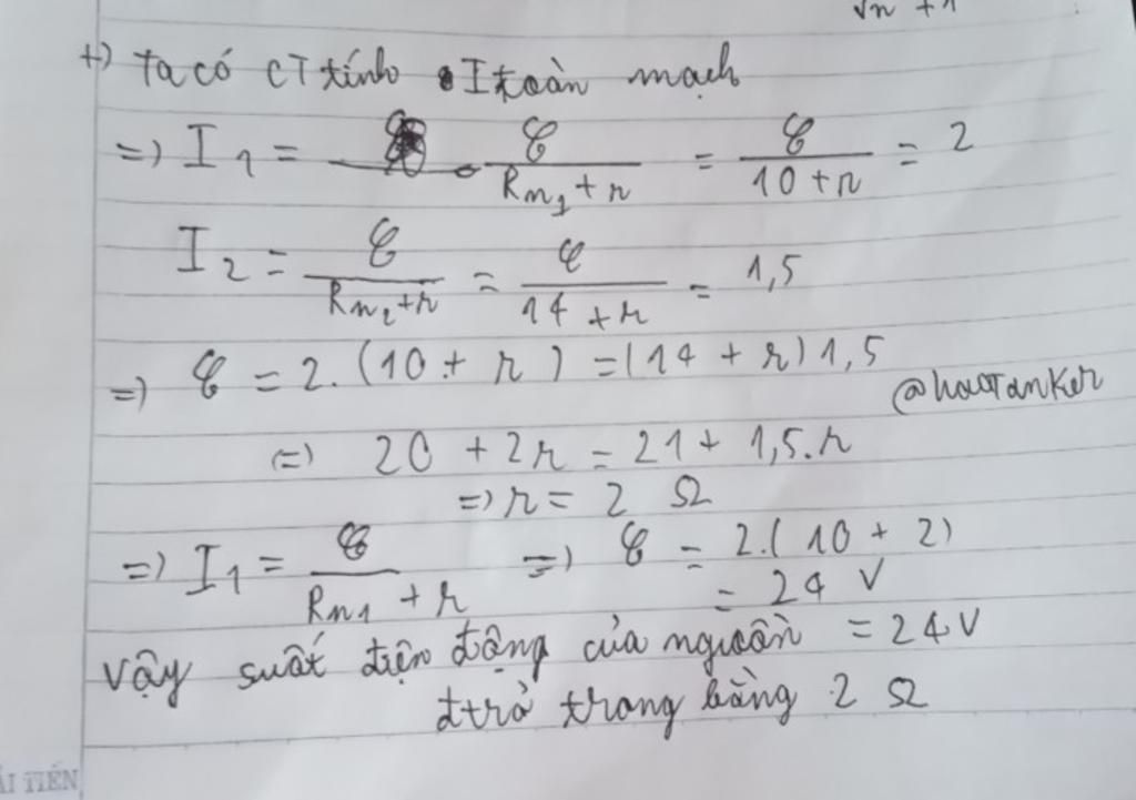 \xi = {I_1}\left( {r + {R_1}} \right) = 2\left( {10 + 2} \right) = 24V