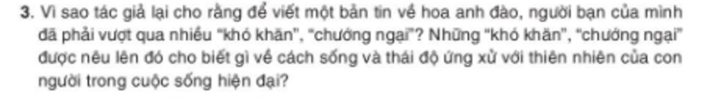 - Tác giả lại cho rằng để viết một bản tin về hoa anh đào, người bạn của mình đã phải vượt qua nhiều “khó khăn”, “chướng ngại” vì với nhiều người, đó là thứ xa xỉ viễn mơ. Nó cũng có thể bị lạc lõng ngay trên trang báo bảo vì nó không phải là thông tin giật gân, thông tin được nhiều người ưa chuộng.