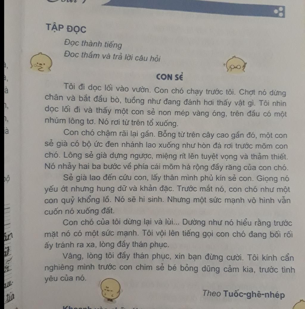 Hình ảnh con sẻ mẹ lao xuống cứu con được miêu tả như sau: lông sẻ già dựng ngược, miệng rít lên tuyệt vọng và thảm thiết. Nó nhảy hai ba bước về phía cái mõm há rộng đầy răng của con chó. Nó lấy thân mình phủ kín sẻ con. Giọng nó yếu ớt nhưng hung dữ và khản đặc. Trước mắt nó, con chó như một con quỷ khổng lồ. Nó sẽ hi sinh. Nhưng một sức mạnh vô hình vẫn cuốn nó xuống đất.
