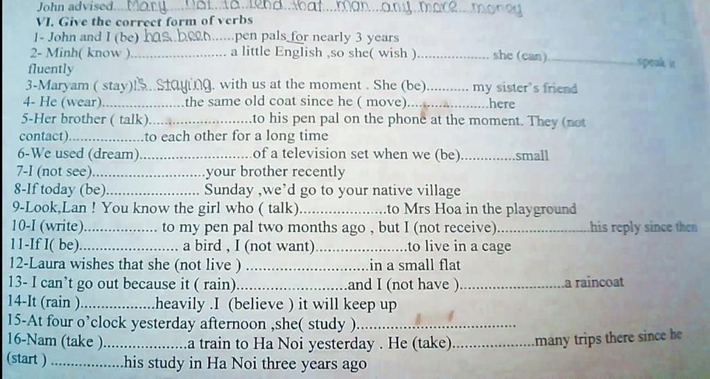 5. Her brother is talking to his pen pal on the phone at the moment. They haven't contacted to each other for a long time. ( HTTD và HTHT)