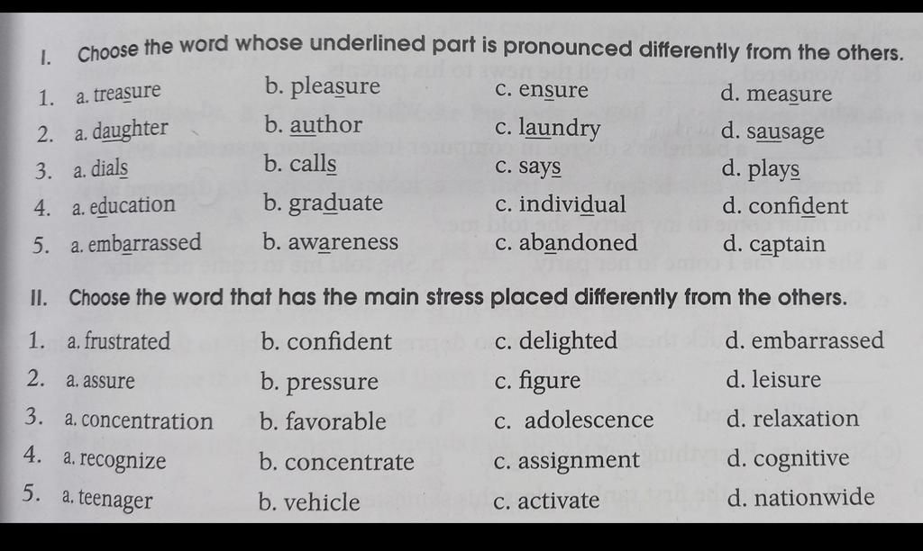 1 .C phát âm là |ʊ| các từ còn lại là |ʒ|