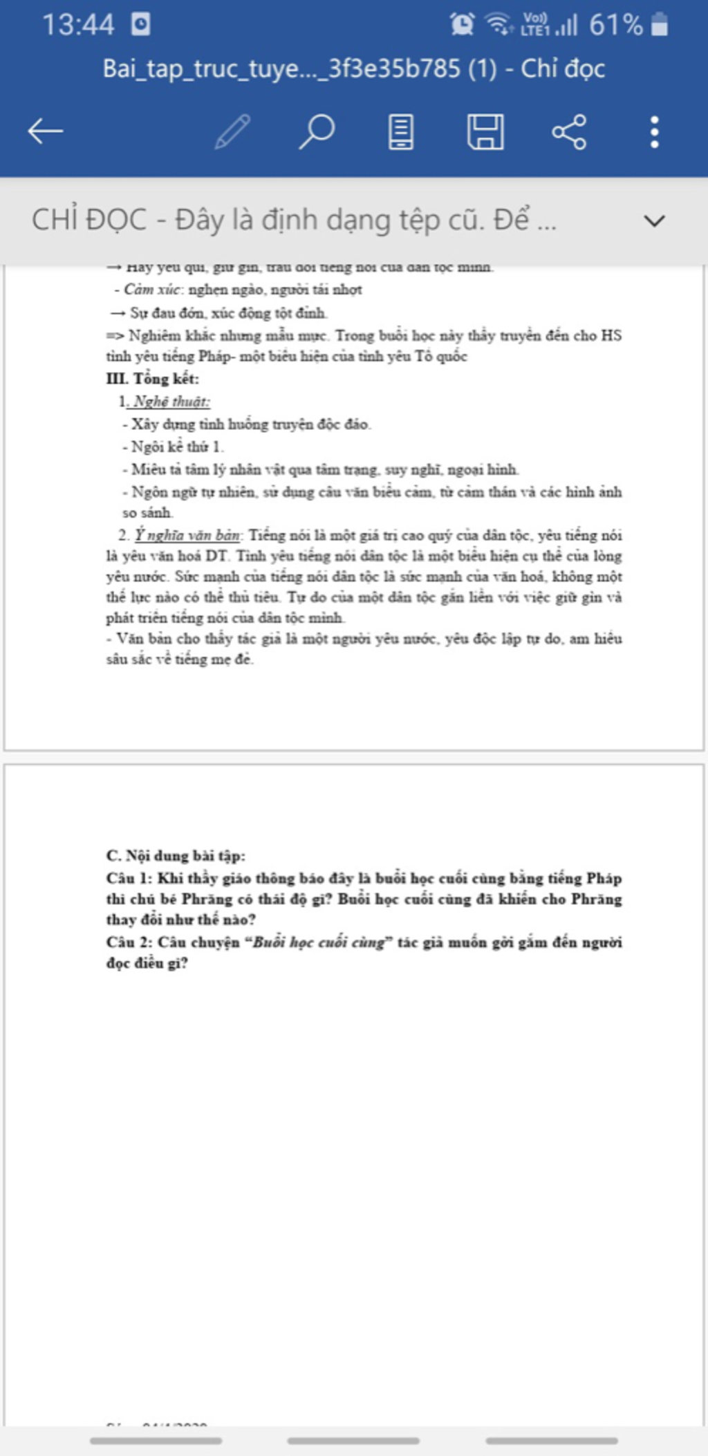 Câu 1:-Khi thầy Ha-men cho biết đây là buổi học tiếng Pháp cuối cùng,Phrăng choáng váng sững sờ và giờ đây cậu đã hiểu rõ sự khác lạ trong buổi sáng hôm nay trên đường đi học,ở sân trường,ở lớp học và đặc biệt là trang phục của thầy giáo.Cậu thấy nuối tiếc về những ngày vừa qua,sự lười biếng trong học tập,sự ham chơi của mình.Sự ân hận của Phrăng thể hiện ở việc cậu đọc bài nhưng cậu đã không đọc được vì cậu không nắm được quy tắc phân từ.Cậu cảm thấy xấu hổ cà tự giận mình.Chính trong tâm trạng ấy mà khi nghe thầy Ha-men giảng ngữ pháp cậu đã thấy thật rõ và dễ hiểu.Cậu hiểu được ý nghĩa thiêng liêng của việc học tiếng Pháp,và tha thiết muốn được thể hiện nhưng cậu đã không còn cơ hội để học tiếng Pháp ở trường nữa.