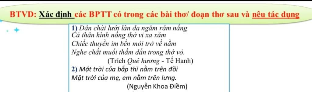 a. Biện pháp nhân hóa qua các từ "im, mỏi, nằm, nghe" nhằm diễn tả con thuyền cũng có những hành động, cảm xúc như con người. Con thuyền ấy đưa người dân chài ra khơi, sau một ngày làm việc cực nhọc trở về bãi cát nghỉ ngơi, để cho vị mặn của biển cả ngấm trong từng thớ gỗ. Biện pháp nhân hóa giúp đoạn thơ sinh động, hấp dẫn hơn b. Biệp pháp ẩn dụ "mặt trời của mẹ" thể hiện người con chính là nguồn sống, ánh sáng của mẹ. Mặt trời của tự nhiên mang ánh sáng, sự sống cho vạn vật thì em bé chính là nguồn sống, động lực của mẹ Chúc bạn học tốt Rút gọna. Biện pháp nhân hóa qua các từ "im, mỏi, nằm, nghe" nhằm diễn tả con thuyền cũng có những hành động, cảm xúc như con người. Con thuyền ấy đưa người dân chài ra khơi, sau một ngày làm việc cực nhọc trở về bãi cát nghỉ ngơi, để cho vị mặn của biển cả n... xem thêm