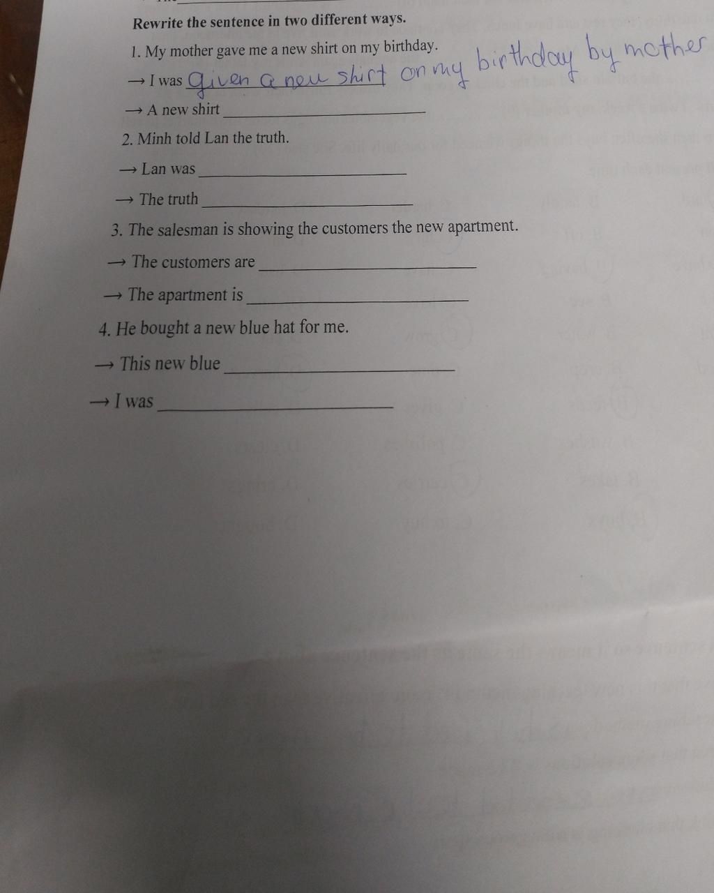$⇒$ A new shirt was given to me by my mother on my birthday.