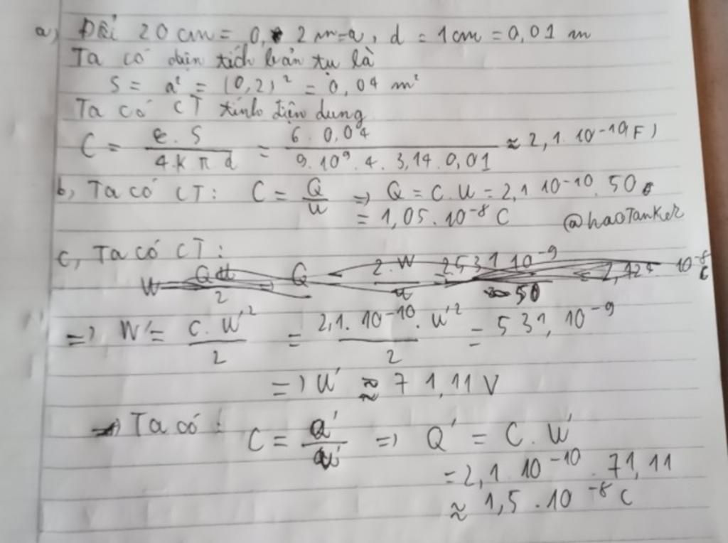 `=>Q'=\sqrt{W.2C}=\sqrt{531.10^{-9}.2.2,12.10^{-10}}=1,5.10^{-8}(C)`