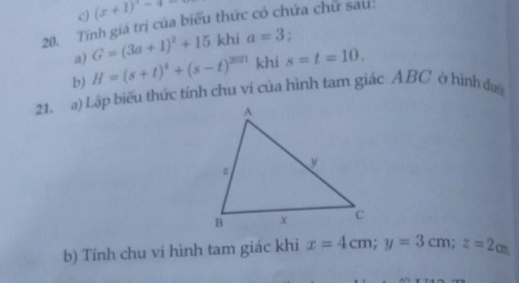 21. a) Lập biểu thức tính chu vi của hình tam giác ABC ở hình dại