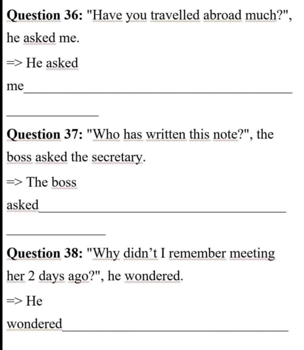 $\text{S + asked sb/wanted to know/ wondered + -wh question + S + V + O (câu 37;38)}$