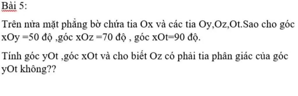 Vì tia `Oz` nằm giữa hai tia `Ot` và `Oy` mà `hat{zOt} = 1/2hat{yOt}`
