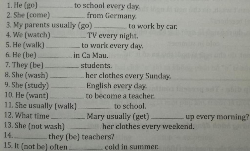 $\dashrightarrow$ S + don't/doesn't + V-infinitive