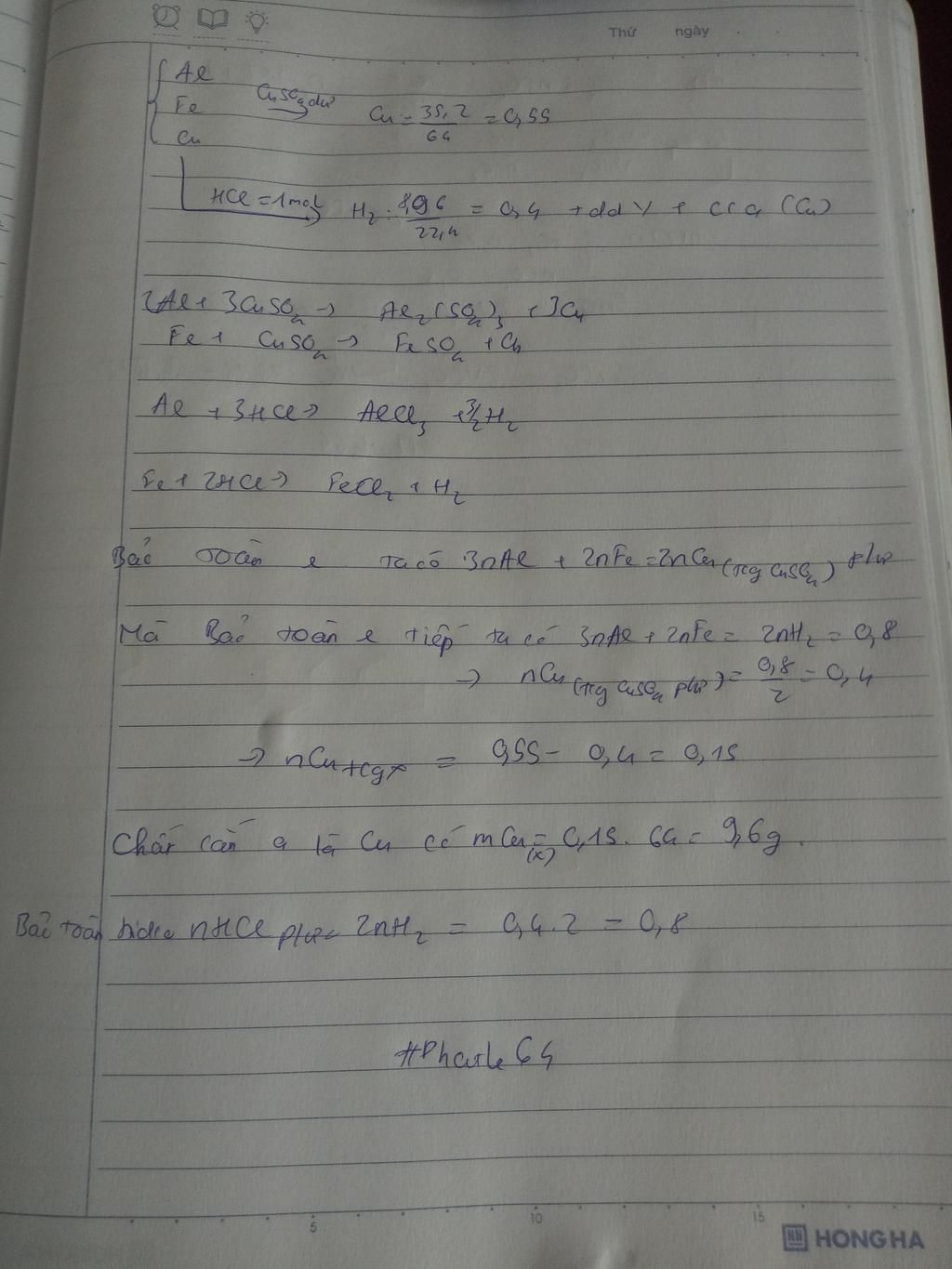 Hỗn hợp X gồm ba kim loại Al, Fe, Cu. Cho m gam hỗn hợp X vào dung dịch CuSO4 (dư) sau khi phản ứng xảy ra hoàn toàn thu được 35,2 gam kim loại. Nếu cũng hòa tan m gam hỗn hợp X vào 500 ml dung dịch HCl 2M đến khi phản ứng xảy ra hoàn toàn thu được 8,96 lít khí H2 (đktc), dung dịch Y và a gam chất rắn. a. Viết các phương trình phản ứng xảy ra và tìm giá trị của a. b. Cho từ từ dung dịch NaOH 2M vào dung dịch Y và khuấy đều đến khi thấy bắt đầu xuất hiện kết tủa thì dùng hết V1 lít dung dịch NaOH 2M, tiếp tục cho tiếp dung dịch NaOH vào đến khi lượng kết tủa không có sự thay đổi nữa thì lượng dung dịch NaOH 2M đã dùng hết 600 ml. Tìm các giá trị m và V1