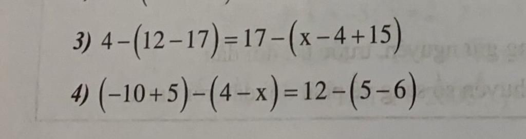 `4) (-10 + 5) - (4 - x) = 12 - (5 - 6)`