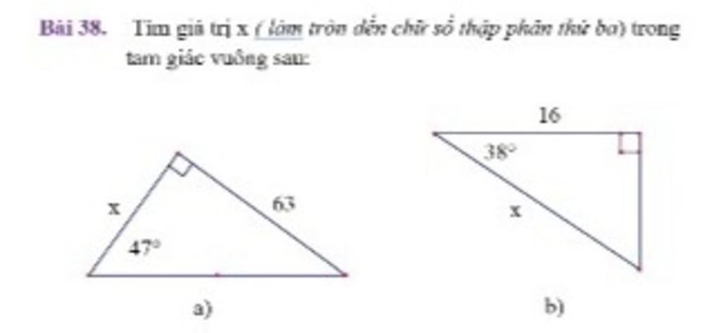 `cos 38^o=(\text{cạnh kề})/( \text{cạnh huyền})=16/x`