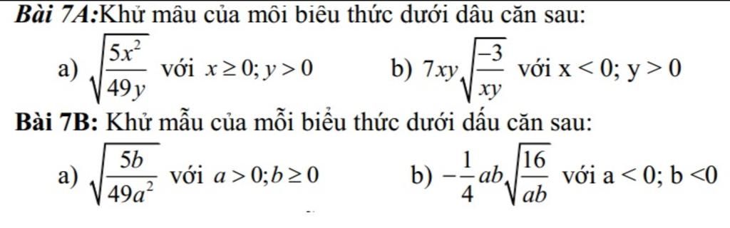 \sqrt {\dfrac{{5{x^2}}}{{49y}}} = \dfrac{{\sqrt 5 .\left| x \right|}}{{7\sqrt y }} = \dfrac{{\sqrt 5 .x.\sqrt y }}{{7y}}\\