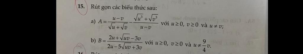 Đáp án: a) `(-sqrt(uv))/(sqrtu-sqrtv)`