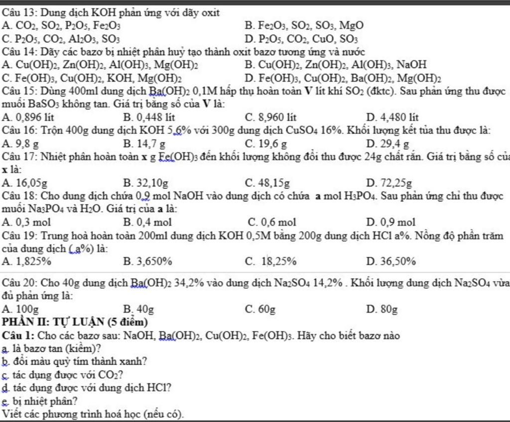 Câu 14: Dãy các bazơ bị nhiệt phân huỷ tạo thành oxit bazơ tương ứng và nước