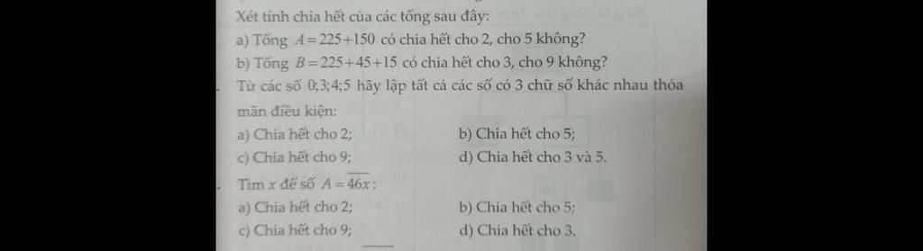 xét tính chia ...................... a, Tổng A không chia hết cho 2 và chia hết cho 5. b, Tổng B ko chia hết cho 3 và 9 Tứ các ......................... a, 354 b,345 c,540 d,450 Tìm x........................ a, 468 b, 460 c, 468 d, 462 mik gửi bn Mong ko có sai sót Rút gọn Rút gọnxét tính chia ...................... a, Tổng A không chia hết cho 2 và chia hết cho 5. b, Tổng B ko chia hết cho 3 và 9 Tứ các ......................... a, 354 b,345 c,540 d,450 Tìm x............ xem thêm