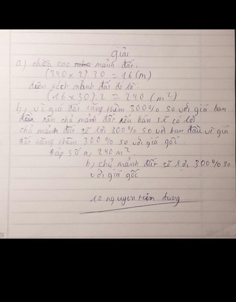 `b,` Vì giá đất tăng thêm `300%` so với giá đầu nên chủ mảnh đất nếu bán sẽ lợi.