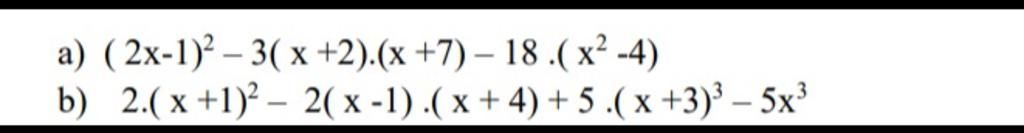 sửa: `b)` $2.(x+1)^2-2.(x-1).(x+4)+5.(x+3)^3-5x^3$ $= 2.(x^2+2x+1)-2.(x^2+4x-x-4)+5.(x^3+9x^2+27x+27)-5x^3$ $= 2x^2+4x+2-2x^2-6x+8+5x^3+45x^2+135x+135-5x^3$ $= (5x^3-5x^3)+(2x^2-2x^2+45x^2)+(135x-6x-4x)+(8+135+2)$ $= 45x^2+133x+145$