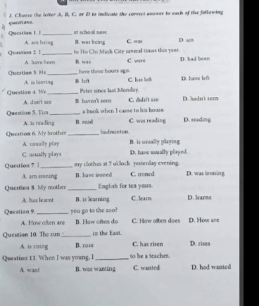 10. D ( Thì HTĐ thường nêu lên những vấn đề là đúng , là chân lí , trong câu ghi The Sun RISES in the East < Mặt Trời mọc ở đằng Đông> được coi là một điều chân lí , không thể chối cãi )