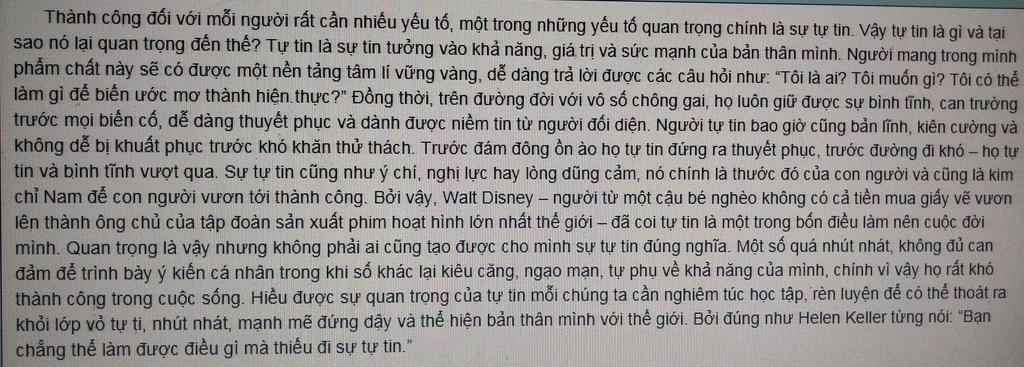 Để đạt được thành công trong mỗi chúng ta không thể không thiếu sự tự tin.Vậy vài trò của sự tự tin là gì?Chúng ta cùng đi tìm hiểu.Sự tự tin là sự tin vào chình mình, tin vào khả năng của bản thân mình sẽ làm được đẻ đạt mục đích đề ra. Đầu tiên,tự tin sẽ mang đến cho con người sự thoải mái, tinh thần lạc quan,yêu đời, không phải suy nghĩ nhiều.Thứ hai, sự tự tin sẽ giúp ta đạt được thành công trong cuộc sống, tạo ra những giá trị nhất định đồng thời khẳng định được giá trị của bản thân trong công việc cũng như cuộc sống.Thứ ba, sự tự tin sẽ tạo được các mối quan hệ bền vững,lâu dài và được mọi người yêu mến.Sự tự tin sẽ góp phần làm xã hội ngày càng phát triển ,văn minh từ đó góp phần lần tỏa những năng lượng tốt đẹp trong cuộc sống.Trong cuộc đời chúng ta có rất nhiều tấm gương về sự tự tin,chẳng hạn nhau Nick Vujiic - người có sự nỗ lực bền bỉ, có sự tự tin vào bản thân để vượt qua khó khăn.Tuy nhiên trong đời sống xung quanh chúng ta không phải ai cũng có sự tự tin.Những người như thế sẽ dễ bị thất bại, không đạt được những mong ước,mục đích đề ra-họ thật đáng bị phê phán. Mặt khác chúng ta cũng cần phân biệt tự tin với tự phụ,tự kiêu.Vì vậy trong mỗi chúng ta cần có sự tự tin để chuẩn bị tốt hành trang bước vào tương lai