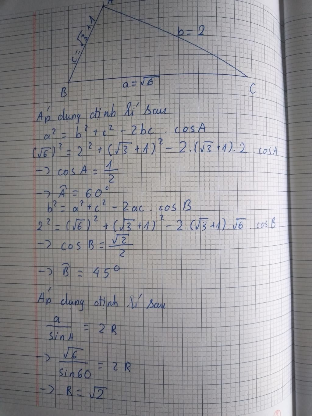 `@ cos A=[b^2+c^2-a^2]/[2bc]=[2^2+(\sqrt{3}+1)^2-(\sqrt{6})^2]/[2.2.(\sqrt{3}+1)]`