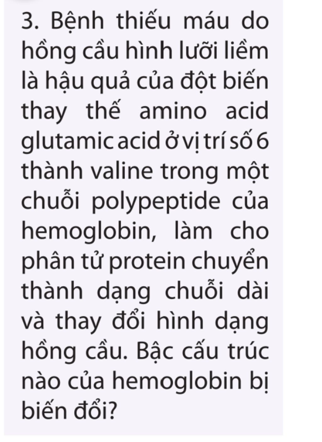 * Bệnh thiếu máu do hồng cầu hình liềm là hậu quả của đột biến thay thế amino acid glutamic acid ở vị trí số 6 thành valin trong một chuỗi polypeptid của hemoglobin, làm cho phân tử protein chuyển thành dạng chuỗi dài và thay đổi hình dạng của hồng cầu. Đây là đột biến cấu trúc bậc 1 của hemoglobin vì cấu trúc bậc 1 của protein là chuỗi thẳng của các amino acid trong một chuỗi peptide hay protein.